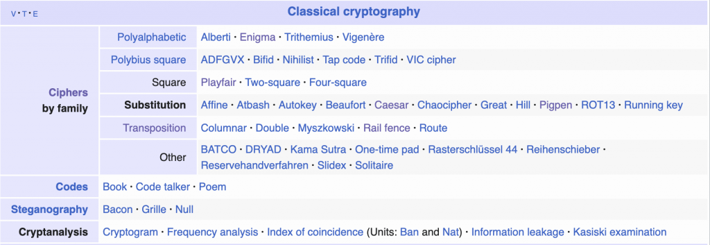 那历史上又出现过哪些比较有名的加密方法呢,这里我直接截图的维斯百科上对古典密码学的总结归类。